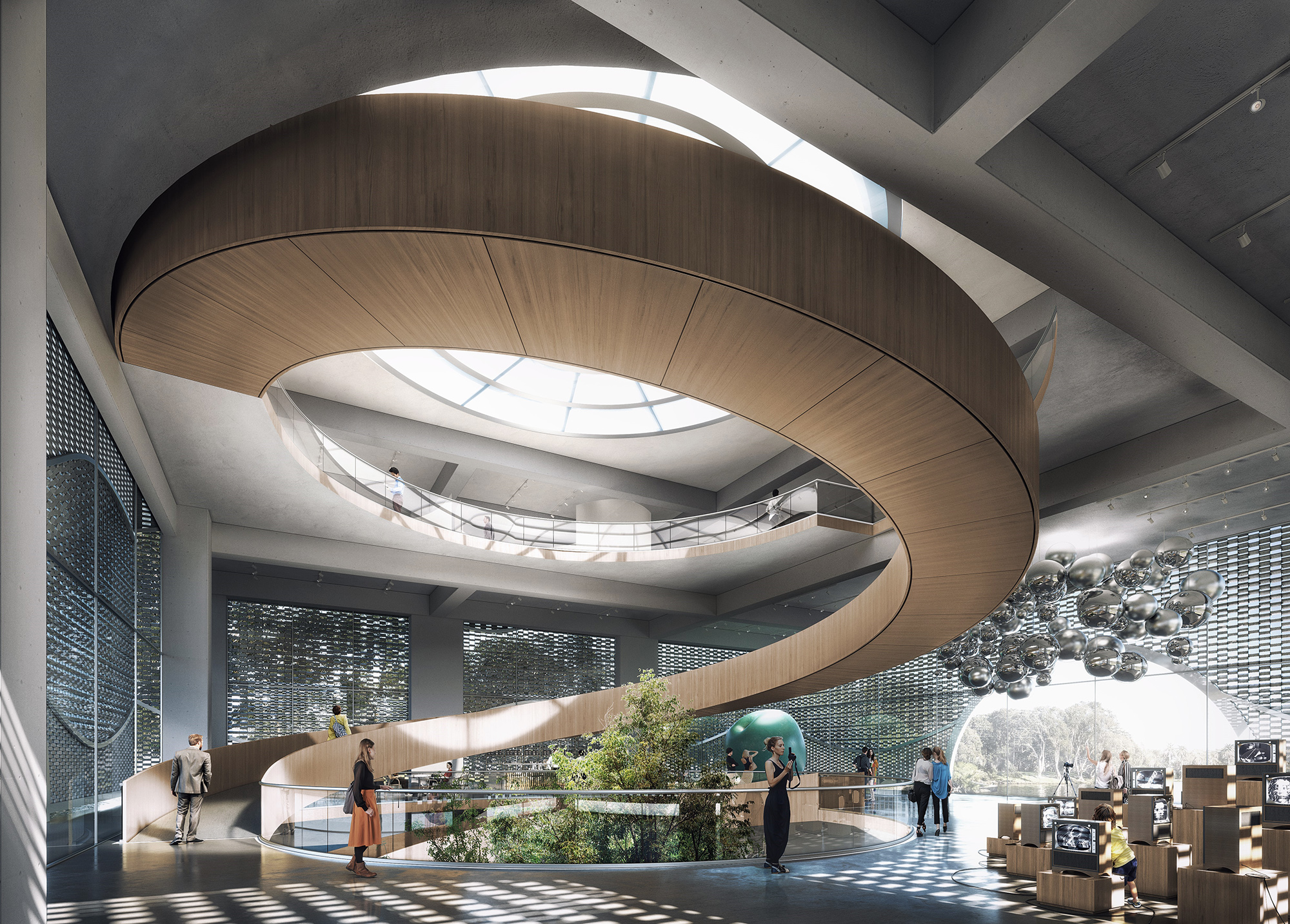 The exterior shot is made from the outside simulating the native oceanian landscape and using that to framing the project. With the use of the perspective line made it from the border of the lake and the eucaliptus frame, the main subject of the image become the museum althought is quite farway putting the two entities in a dialog. The interior shot, want to emphasize the activities of the space in a visual relation with the outsie through the use of the light and composition. Starting form the border of the image there is the landscape full in light, going inside is full of activities in a studied shadow that converge the observator step by step in the center of the image where is situated the big eliptical stair that bring another time the eye outside through the skylight window.