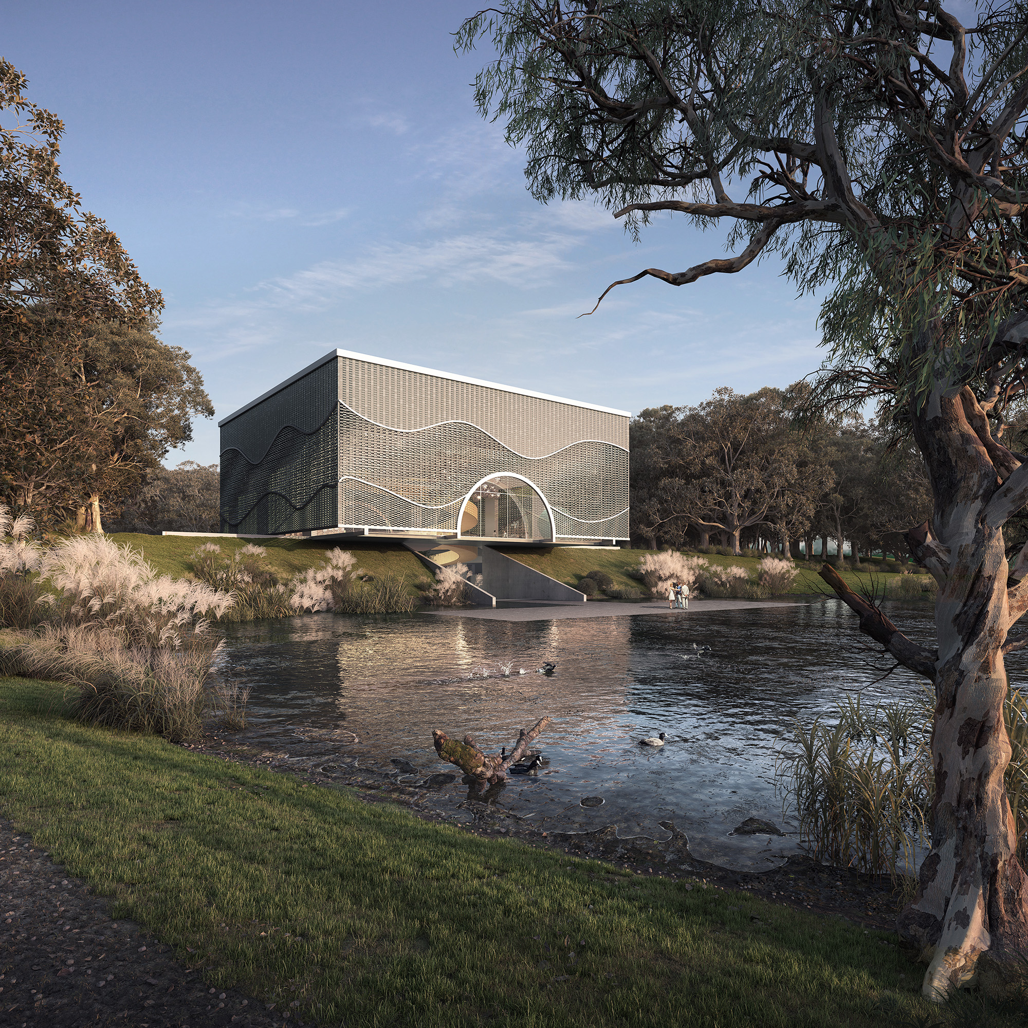 The idea is to create a space with a symply defined geometry that at a first look seem closed to himself but in strectly relation with the australian landscape, thanks to the detail that decompose and refine that strictly geometry. The interior is composed by three free plans usefull for art installation with a monumental stair theat collegue the floors. The curtain wall that compose a strictly cube is made by glass and a curtain bricks rotated and opened in order to decompose the volume and open the views from the interior throught the outside. At the groundfloor a simply slab interact to the lake outside. A tongue to live the outside a bringing it in to the architecuture.