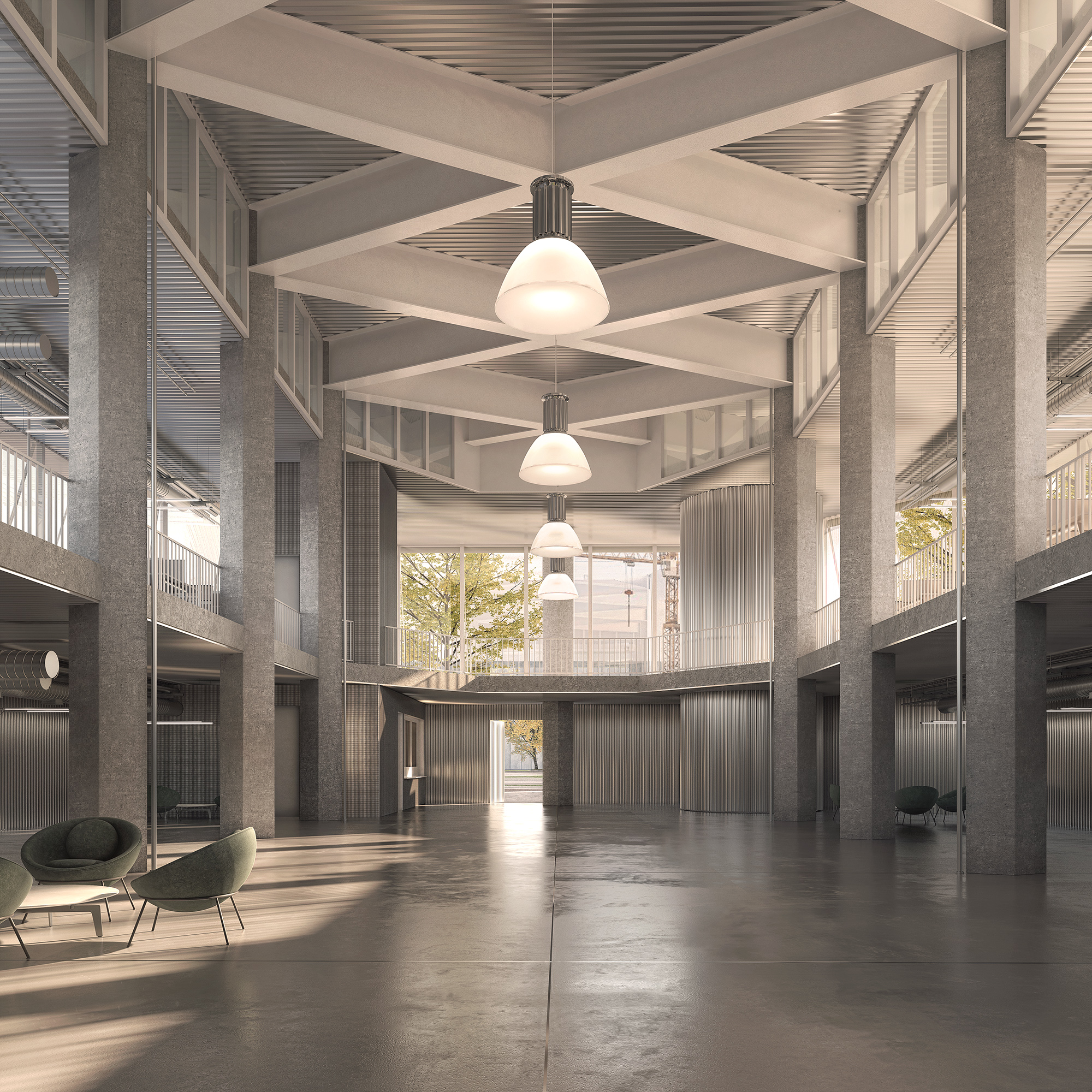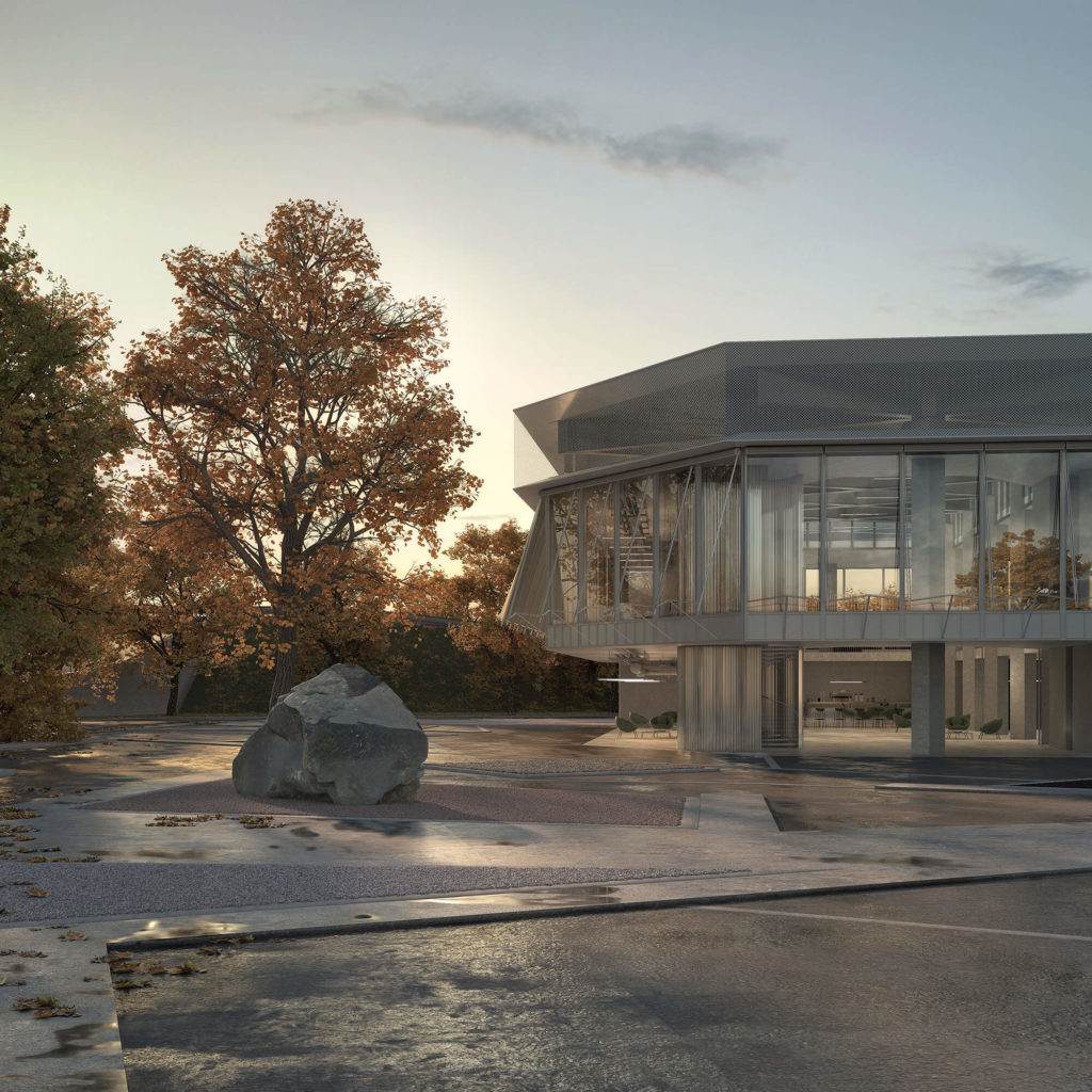 The sharp volumes and the industrial detailed materials gives the building a strong identity in the surrounding. At the same time, the plan libre and the possibility to open the groundfloor’s panels allowing the panorama to permeate inside the building. The interior of the building is designed around a vast double-height central void. Around this “un-core” are arranged the various spaces required by the program, with particular attention not to undermine the monumentality of the interior.