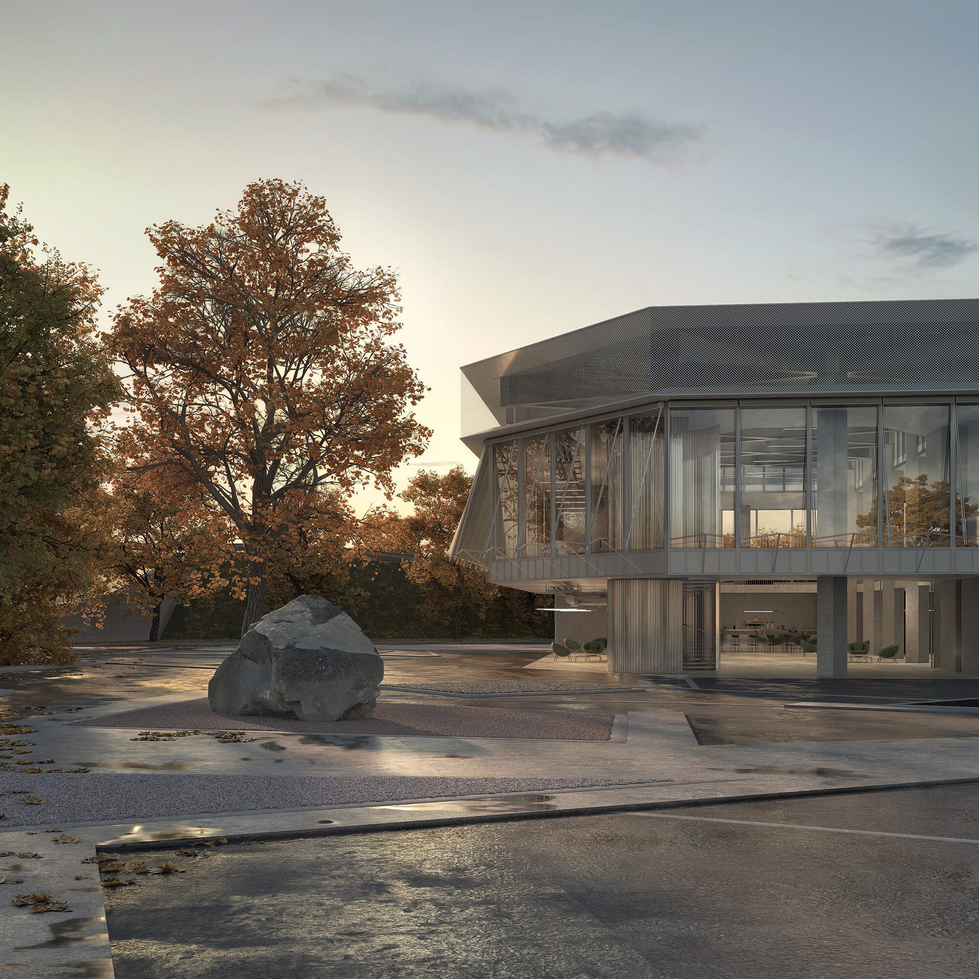 The composition of the external shot wants to emphasize the presence of the design in relation with the exterior landscape. The choice of the golden hour and the autumn atmosphere create a moment of calm and stability between the two realities, giving rise to an unique “non-place” to be observed.